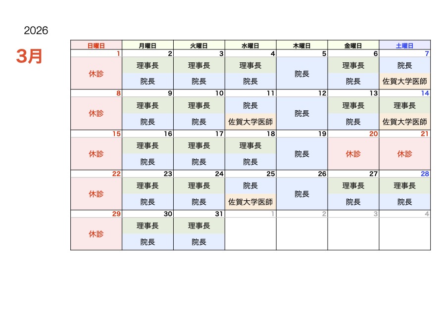 3月 担当医診療カレンダー
